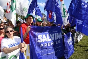 L'obiettivo politico non cambia. Il raduno di Pontida è all'insegna di uno slogan: "Salvini premier". È la scritta gigante che campeggia sul palco, insieme a quella per il Sì ai referendum consultivi per l'autonomia di Lombardia e Veneto. Il pratone davanti al palco "è strapieno" con circa 50mila persone dicono dalla Lega, e sono 150 i pullman arrivati da tutta Italia. Al Governo "cancelleremo la legge Mancino e la legge Fiano, le idee non si processano, queste cose si facevano in Urss" dice dal palco Salvini, secondo cui quelli del centrosinistra "si comportano come il regime negli anni Venti che imbavagliava" gli oppositori.