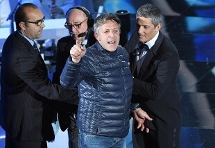 C'è Fiorello, che apre la prima serata. Subito il "contestatore" che irrompe sul palco come già è accaduto a Sanremo in edizioni passate. Tutti ricordano l'uomo appeso alla balaustra della galleria del teatro durante una delle edizioni condotte da Pippo Baudo. L'uomo arriva mentre Fiorello sta cominciando a parlare e pronuncia alcune frasi, tra cui "procuratore mi deve ascoltare...". Interviene un assistente di studio che conduce l'uomo giù dal palco, mentre Fiorello cerca di calmarlo.