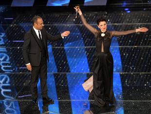 Carlo Conti presenta il primo big della serata: Nina Zilli che canta "Sola". Look dorato con ampie maniche è la sua terza partecipazione al Festival.