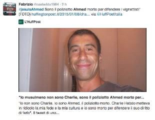 E così accanto all'hashtag #JeSuisCharlie in solidarietà con i morti della rivista satirica, su Twitter spopola un nuovo hashtag: #JeSuisAhmed rilanciato da Dyab Abou Jahjah, scrittore di origine libanese che l'ha spiegato in questo post: "Io non sono Charlie. Io sono Ahmed, il poliziotto morto. Charlie Hebdo metteva in ridicolo la mia fede e la mia cultura e io sono morto per difendere il suo diritto di farlo":