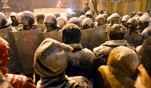 Gli agenti in assetto antisommossa sono entrati in azione attorno alle tre di notte e hanno sgomberato a manganellate un presidio (con tende militari e barricate) allestito dai dimostranti davanti al palazzo presidenziale: secondo il partito ultranazionalista Svoboda, circa dieci manifestanti sono rimasti feriti e uno avrebbe delle costole rotte, ma anche tre poliziotti hanno riportato delle contusioni. Altri scontri tra la polizia e i militanti di Svoboda sono scoppiati davanti al tribunale amministrativo quando la corte ha rinviato a venerdì l'udienza d'appello contro l'arresto di alcuni manifestanti.