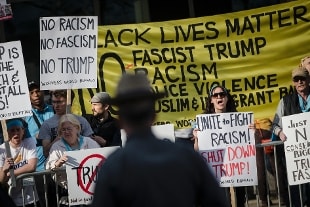 Anche nello Stato di New York Donald Trump è stato accolto da attivisti che hanno contestato la campagna del candidato alla nomination repubblicana, con cartelli e slogan. Nel corso del comizio di Buffalo durante l'intervento di Trump si sono scatenati disordini tra i contestatori e l'apparato di sicurezza: sei attivisti sono stati arrestati