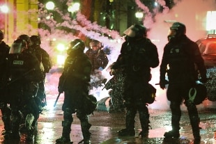 Gli uomini della Guardia Nazionale hanno indossato i caschi e i giubbotti antiproiettile, mentre i dimostranti hanno bloccato il traffico e incendiato i cassonetti, intonando cori come "Not my president" e "We resist President Trump" ("Non è il mio presidente" e "Resistiamo a Donald Trump").