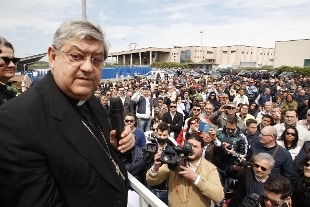 Il cardinale Sepe, arcivescovo di Napoli e originario di Carinaro, accarezza la bimba aggiungendo: "Gettare sulla strada tanta persone è qualcosa che coinvolge le famiglie, le mogli e i figli. Non possiamo permettere che tanti bambini perdano la felicità".