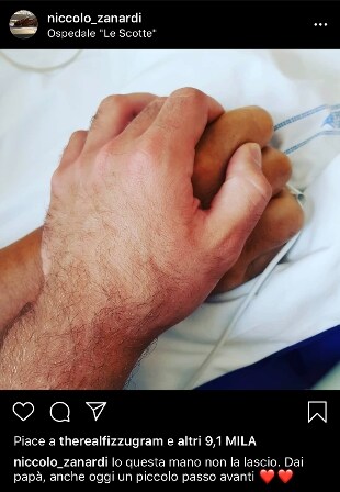 Poche, dolcissime, righe per accompagnare una foto che commuove, quella di un figlio che tiene la mano del padre ricoverato ormai da cinque giorni in terapia intensiva. E' l'ultimo post di Niccolò, il figlio dell'ex pilota Alex Zanardi, ancora in gravi condizioni ma stabile dopo l'incidente in handbike. "Io questa mano non la lascio. Dai papà, anche oggi un piccolo passo avanti", scrive su Instagram Niccolò, che già ieri aveva dedicato un altro messaggio al padre sul social: "Forza papà, ti aspetto, torna presto".