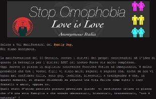 "Per voi oggi è il Family Day - scrive il collettivo - per noi ogni giorno è buono per far crescere il rispetto e la comprensione dentro ogni famiglia e per ogni famiglia. "Per questo Anonymous ha deciso di intervenire, per far capire che ci sono anche i diritti Lgbt e Gender". Anonymous vorrebbe "che tutte le famiglie che ci sono oggi, concretamente, in Italia, fossero rispettate per quello che sono". "Oggi sarete in piazza in migliaia - si legge ancora sul blog - nonostante facciate fatica a immaginarlo, è molto probabile che tra i vostri figli vi siano molti ragazzi e ragazze che, anche se non vi hanno mai confidato nulla, sono gay, lesbiche, bisessuali e transgender e che, in questo momento, si stanno chiedendo se avranno una vita felice come tutti i loro fratelli e amici, oppure no. Quali stati d'animo pensiate possano prevalere quando vi sentiranno urlare in piazza che c'è una sola famiglia e che essere omosessuali, bisessuali, transessuali, 'non è naturale'?".