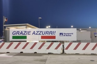 Gli Azzurri atterrati a Fiumicino: uno striscione per ringraziarli