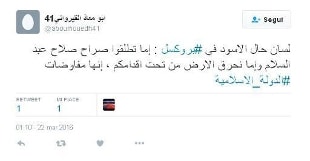 Le esplosioni di Bruxelles sono la risposta dello Stato Islamico alla cattura di Salah Abdeslam, il kamikaze mancato e la presunta mente delle stragi di novembre a Parigi, catturato dalle forze di sicurezza belghe. E' quanto sostengono in rete jihadisti sostenitori del Califfato dello sceicco Abu Bakr al Baghdadi. "I leoni di Bruxelles vi dicono: o lasciate libero Salah questo è il negoziato dello Stato Islamico", twitta Abou Maouedh el Qayrawani, con un cognome che rivela le sue origini tunisine. Qayrawan è infatti l'odierna città della Tunisia che, nel periodo califfato islamico, fu la capitale del governatorato dell'Ifriqiya. "Bruxelles diventerà presto una delle province dello Stato islamico... dovete solo aspettare", scrive un terzo, seguito da un quarto utente che ribadisce le minacce: "Le esplosioni di Bruxelles sono solo una piccola parte del caro conto che gli adoratori della croce (i cristiani) dovranno pagare", scrive sotto il nome "Estremista: TNTbomb6"