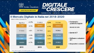 La progressione è stata netta, anche se inferiore a quella del 2019, per Servizi Ict (12,7 miliardi, +3,3%) e Dispositivi e Sistemi (19,3 milardi, +1,3%). Anche per i Contenuti Digitali e Digital Advertising (12,6 miliardi, +4,4%) l'andamento è stato molto positivo rispetto alle dinamiche generali. In calo, oltre ai servizi di rete (19,2 miliardi, -6,9%), anche Software e Soluzioni Ict (7,5 miliardi, -2,3%).