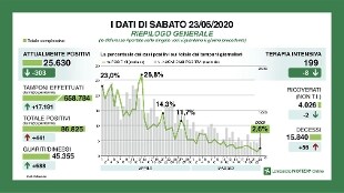 Il totale complessivo dei positivi riscontrati in Lombardia dall’inizio della pandemia a oggi sono 86.825, i nuovi casi positivi sono 441 più di ieri (2,6% il rapporto con i tamponi giornalieri).