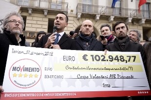 "Mentre Renzi chiama De Benedetti per farlo guadagnare in Borsa, noi i soldi li restituiamo ai cittadini e ai servizi essenziali del Paese". Così, infine, Luigi Di Maio, consegnando a Torino un assegno simbolico di oltre 100mila euro all'Aib, l'Associazione dei volontari anti incendi boschivi del Piemonte. La somma è la metà di quanto i consiglieri regionali pentastellati del Piemonte hanno tagliato dai loro stipendi nell'ultimo anno.