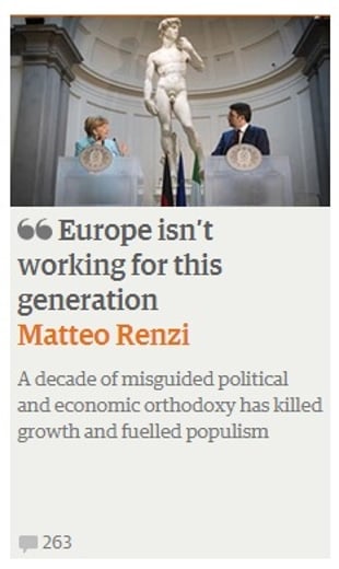 Renzi sul Guardian: "Italy is back", ma la Ue è "missing in action"