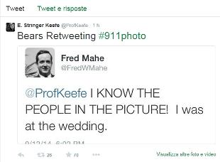 Fred Mahe è riuscito a mettersi in contatto con Elizabeth Stringer Keefe poco più di 15 ore fa. Lo ha fatto con un tweet : «Io conosco le persone nella foto, ero al matrimonio!». La foto era in una cornice sulla sua scrivania al 77esimo piano della torre 2, e assicura: «Stanno tutti bene».