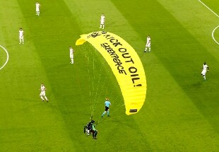 L'uomo è un attivista di Greenpeace. Sul paracadute giallo troneggiava la scritta "Cacciate il petrolio". Il paracadutista ha valutato male l'atterraggio e ha colpito con l'elica due persone.