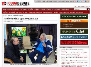 Riappare Fidel Castro. Dopo quattro mesi dalle sue ultime immagini sui media, l'ex presidente cubano, 87 anni e fuori dalla scena politica dal 2006, si è lasciato fotografare in una conversazione con il giornalista e scrittore spagnolo Ignacio Ramonet, incontrato nella sua abitazione a Cuba per parlare dell'ultimo libro dell'ex lider su Hugo Chavez. La notizia è stata messa su Facebook dallo stesso Ramonet e ripresa dal sito Cubadebate e, di seguito, da tutti i media locali. Castro, le cui apparizioni sono sempre più rare, appare in buono stato di salute, vestito sportivo con una t-shirt blue e una felpa. Nell'incontro, durato circa due ore, i due hanno affrontato diversi problemi di attualità: dalla politica all'ecologia. Ramonet, intellettuale spagnolo trasferitosi in Francia, aveva pubblicato nel 2006 un libro sul politico cubano dal titolo "Cento ore con Fidel".