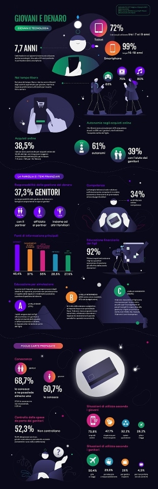 Con la progressiva digitalizzazione dei pagamenti emerge con forza il tema della gestione del denaro non più solo fisico ma digitale. Strumento preferenziale per l’utilizzo dei più giovani – che difficilmente avrebbero accesso a bancomat, conti correnti strutturati e carte di credito – sono le carte di debito o carte prepagate. Il 68,7% dei genitori dichiara di conoscerli come strumenti finanziari e di possederne almeno uno, mentre il 27,2% pur conoscendoli non ne possiede, infine, solo il 2% non sa di cosa si tratti. Tra i giovani la consapevolezza è leggermente più bassa: il 60,7% dei ragazzi conosce le carte di debito e oltre la metà di loro (più del 60%) ha sentito parlare di carte prepagate studiate appositamente per giovani.