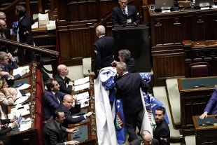 Lavori in aula sospesi per pochi minuti dopo che i deputati di Forza Italia hanno mostrato striscioni con la scritta: Finalmente una cosa di centrodestra. 25 M5s non hanno partecipato al voto. Pd: FI festeggia, unica opposizione siamo noi. Salvini: ne sono orgoglioso