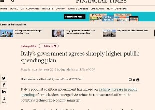Anche il Wsj sottolinea la pericolosità di un deficit così alto: “L'obiettivo di un deficit/Pil al 2,4% nel 2019 mette il governo anti-establishment" M5s-Lega "in rotta di collisione con l'Unione europea". Si legge sull’autorevole quotidiano finanziario Usa, commentando la stima contenuta nella nota di aggiornamento al Def, approvata dal Consiglio dei Ministri, e riecheggiando l'analoga osservazione fatta dal Financial Times.