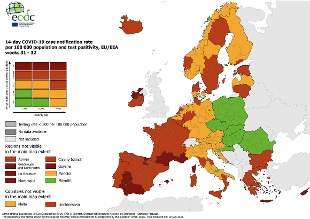 Peggiora la situazione in Germania (tornata tutta in giallo con alcune regioni ad Ovest in rosso), in Francia (tornata tutta rossa, con il Sud rosso scuro), nei Paesi Baltici (due rossi e uno solo giallo) e in Grecia (tutta rossa).