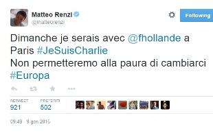Marcia antiterrorismo per Charlie Hebdo, Renzi su Twitter: domenica sarò a Parigi con Hollande