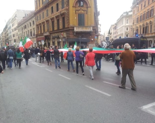 Per le vie di Roma sfilano i rappresentanti dei quartieri simbolo della periferia romana, da Tor Bella Monaca a Tor Sapienza, la zona al centro delle cronache di questi giorni per le violente proteste anti immigrati. Al centro del corteo è stato srotolato un lungo Tricolore, al quale fanno da cornice decine e decine di bandiere sventolate in aria.