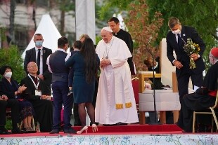 Al termine dell'incontro con i giovani nello stadio di Kosice, Papa Francesco ha pregato il Padre Nostro in slovacco con i 25mila ragazzi presenti.