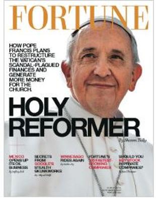 The "Holy reformer", il Santo riformatore titola la copertina del numero di settembre anticipato dall'edizione on line. Qui vi campeggia la foto sorridente di Bergoglio, mentre il titolo principale dei sevizi interni gioca sulle parole: "This Pope means business", che vuol dire 'Questo Papa fa sul serio'. Ma il termine business rimanda al motivo dell'interesse del giornale, che si occupa quasi esclusivamente di finanza ed è famoso perché ogni anno stila la classifica degli uomini più ricchi del mondo. Fortune arriva dunque a dire che "il popolarissimo Francesco è più di un pontefice" perché "lui è un manager di primo livello che sta riformando le finanze in difficoltà del Vaticano".