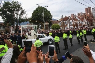 Papa Francesco si è fatto male sbattendo sulla papamobile mentre attraversava il centro di Cartagena, tra due ali di folla. La contusione si estende sopra e sotto l'occhio sinistro, sull'arcata sopraccigliale e sullo zigomo. È stato subito medicato con due piccoli cerotti e la veste è stata smacchiata anche se l'alone del sangue è visibile. "Ora sta bene, gli è stato applicato del ghiaccio", ha traanquillizzato i giornalisti il portavoce, Greg Burke.