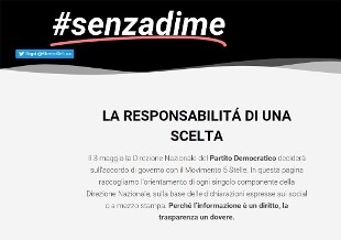 Intanto il sito senzadime.it che aveva elencato le posizioni politiche diverse nei dem a proposito dell'appoggio al M5s nella costituzione di un governo, curato da un simpatizzante del Pd, ha prima pubblicato poi cancellato e sostituito con 'omissis' i nomi dei democratici favorevoli e contrari. Questa iniziativa aveva scatenato un'ulteriore bufera nel Pd. In calce alla home page c'è una piccola presentazione di colui che rivendica la parternità dell'iniziativa: "Sono Alberico De Luca - scrive - elettore del Pd, ho realizzato questo sito per offrire uno strumento di trasparenza sulle scelte del Partito Democratico in merito a un eventuale accordo di governo con il Movimento 5 Stelle".