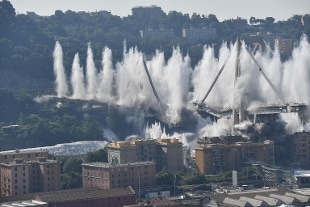Con un sordo boato, la dinamite e il plastico collocati su piloni e stralli delle pile 10 e 11 dell'ex viadotto Morandi hanno fatto collassare la struttura. Forte emozione da parte del sindaco Marco Bucci che con il governatore Giovanni Toti e i ministri dell'Interno Matteo Salvini, dello sviluppo economico Luigi Di Maio e della Difesa Elisabetta Trenta ha assistito all'implosione controllata.