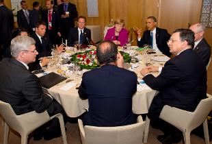 Le forze europee, sulla scia delle dichiarazioni del capo della Casa Bianca chiedono a Mosca di "ritirarsi" al più presto dai territori ucraini. Allo stesso tempo, però, un documento dei sette grandi dichiara "inaccettabile l'azione del governo di Kiev" che in 24 ore ha portato all'uccisione di trecento filorussi. Al centro della cena di ieri sera, anche di cambiamenti climatici e il negoziato sull'accordo di libero scambio Ue-Usa.