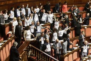 I senatori del Movimento Cinque Stelle, con indosso le magliette con la scritta "Schiavi mai", si sono incatenati e ammannettati tra loro. La seduta è stata sospesa per qualche minuto. Tensioni tra i senatori del M5S e Calderoli. "Non ci muoviamo e ci dovrete portare via con la forza" dichiara la senatrice pentastellata Nunzia Catalfo. Dura la risposta di Calderoli: "Ora vado a cercare i fabbri e in un modo o nell'altro uscirete di qui".
