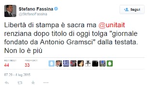 "La libertà di stampa è sacra ma l'Unità renziana, dopo titolo di oggi tolga 'giornale fondato da Antonio Gramsci' dalla testata. Non lo è più".