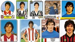 Ecco Paolo Rossi, con la maglia del Lanerossi Vicenza, del Como, del Verona, del Milan e naturalmente della Juventus e della Nazionale di calcio, immortalato dalle figurine d'epoca Panini