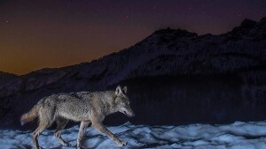 Nel Parco del Mont-Avic, in Valle d'Aosta. Il predatore si aggira sulla neve della primavera appena iniziata, sotto il cielo stellato