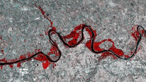 La foto è il risultato di più immagini sovrapposte, acquisite prima e dopo la piena: in nero è evidenziato il fiume, in rosso le aree inondate e in bianco i centri abitati