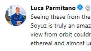L'astronauta di Paternò di 42 anni ha scelto di commentare, come primo cinguettio dallo Spazio, il suo 'viaggio incredibile' a bordo della Soyuz con l'americano Andrew Morgan e il russo Aleksandr Aleksandrovič Skvorcov