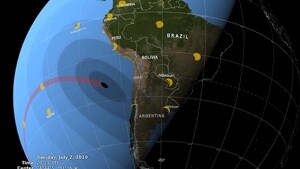 L'oscuramento del Sole sarà totale nel Pacifico meridionale a est della Nuova Zelanda, in Cile nella Regione di Coquimbo e in Argentina, con una durata massima di visibilità di 4 minuti e 32 secondi