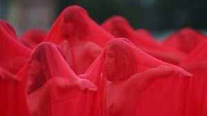 I partecipanti, scelti tra 12mila aspiranti, hanno posato in piedi e sdraiati sul cemento coperti soltanto da un telo trasparente rosso nonostante la temperatura di 7 gradi celsius