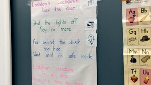 "Blocca, blocca, chiudi la porta / Spegni le luci, non dire altro / Vai dietro la scrivania e nasconditi / Aspetta finché non è sicuro all'interno / Blocca, blocca, è tutto finito / Ora è tempo di divertirti!