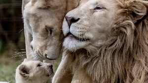 Tia e Aga, splendida coppia di leoni bianchi con i loro cinque cuccioli si concedono all'obiettivo del fotografo