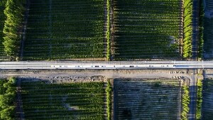 Un treno ad alta velocità sfreccia lungo i binari che passano attraverso il deserto di Gobi, tagliando a metà la regione autonoma di Xinjiang Uygur nel nord-ovest della Cina. Il locomotore viene immortalato dall'alto da un drone, lungo i 1.776 chilometri che collegano Lanzhou, capitale della...
