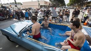 Si guida tramite una cloche in ginocchio. I sedili hanno lasciato spazio a delle sedute e le bocchette lungo il perimetro interno dell'abitacolo servono per fare delle bolle spumeggianti. Una perfetta vasca idromassaggio allestita a bordo di una Cadillac Coupe DeVille che sfreccia sotto gli occhi...