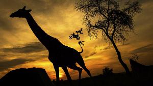 Pretoria, Sudafrica. Il pilota di Motocross Freestyle della Red Bull, Maikel Melero, ritratto durante un salto mentre passa una giraffa. I colori sono quelli della savana al tramonto. Sabato si terrà la XIV edizione dell'ultimo round del Tour Mondiale dei Red Bull X-Fighters.