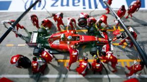 I concitati istanti del pit stop Ferrari durante la seconda sessione di prove del Gran Premio d'Italia che si correrà domani a Monza. Le immagini sono state scattate con l'uso di lenti tilt shift, usate soprattutto in architettura per la correzione prospettica degli edifici.