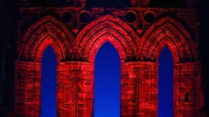Giochi di luce illuminano le rovine della storica abbazia benedettina di Whitby sulla costa nord-orientale dell'Inghilterra dove in concomitanza di Halloween si tiene ogni anno il Festival gotico. L'Abbazia che ha ispirato il Dracula di Bram Stoker, dove è espressamente citata nel capitolo VI, si trova su un promontorio e per secoli è stata un punto di riferimento per i naviganti.