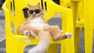 Un gatto, occhiali da sole e aria rilassata, si gode lo spettacolo dei deltaplani che atterrano sulla spiaggia di Sao Conrado a Rio de Janeiro. Una piattaforma situata sulla Pedra Bonita, una montagna a 696m sul livello del mare da cui si gode di uno dei panorami più spettacolari sulla città,...