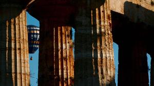 Le mongolfiere sorvolano l'aria degli scavi di Paestum. È la quinta edizione del Festival internazionale della mongolfiera, in corso dal 4 al 12 ottobre intorno all'area archeologica dell'antica città della Magna Grecia.