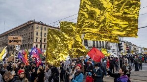 Protesta contro i respingimenti al confine con la Bielorussia. I manifestanti sventolavano bandiere fatte con coperte termiche che ricordano le dure condizioni alle quali vengono esposti i profughi, costretti a passare giorni e notti nei boschi