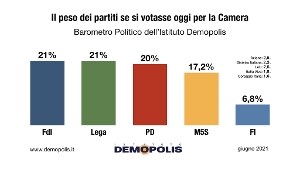 Lega e Fratelli d’Italia primi partiti, alla pari, con il 21%. PD staccato di un punto. Pietro Vento: “Per la prima volta, i 3 partiti maggiori sono distanziati di appena 1 punto. E le 4 forze politiche principali sono dentro una forbice inferiore ai 4 punti”.